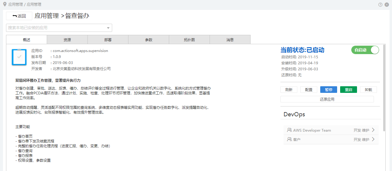 如果本地检查没有应用com.actionsoft.apps.supervision,请先在AWS PaaS平台中安装本应用。