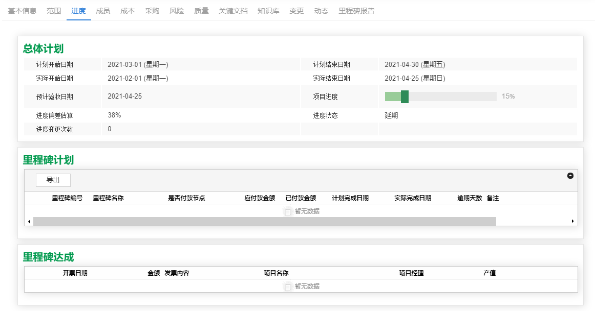 查看项目重要信息,如项目名称及编号、项目经理、协助人设置、项目状态、项目阶段等。